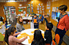 Elevene setter seg på teppet på gulvet, de prater og klenger litt på hverandre, før alle etter hvert retter oppmerksomheten mot det læreren skal si.