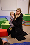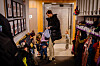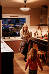 Familien er hjemme igjen etter henting i barnehagen. Barn, støvler, utedresser, matbokser og sekker bæres inn i gangen og opp den smale trappen.