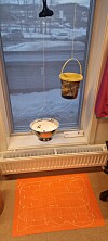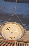 Det ble lagt et stort ark på gulvet under fatet med godteri, med lim på, og vi hang opp en bøtte med fjær. Vi ble rett og slett også nødt til å ofre en liten julekule for å være helt sikker på at fellene var av ytterste kvalitet.