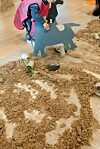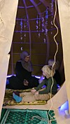 Det var tydelig at toåringene opplevde formidlingen som spennende, og de utforsket rekvisittene med hele seg. Mens noen ble sittende lenge i sanden, var edderkoppen mest populær hos andre. Et av barna utbrøt «mamma!» og kastet seg over et bilde av en kvinne i hijab og fargela entusiastisk på arket. Andre så lenge på lysene, utforsket teksturen i teppene og lekte med pappfigurene.
