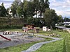 Lag en landsby-sone ute med et lekehus, en gapahuk og et utekjøkken.