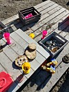 Lag et utekjøkken med tilgang til vann, sand, kopper og ting som kan brukes sammen.