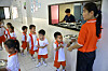 Når det nærmere seg spisetid, stilles barna opp på to rekker og marsjerer til vaskestasjonen. Barna vet godt hva de skal gjøre, ingen trenger å mases på. Det er disiplin i rekkene. Selv om barna snakker med hverandre, er støynivået lavt. Ingen roper og skriker.