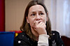 Hun må av og til stoppe når hun snakker og bruke litt tid for å finne ordene som mangler.