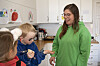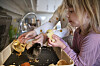Mens eggene ligger i maskinen, tar barna dem opp av og til. De får kikke eller nusse på dem.