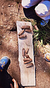 Elevene samler seg engasjert rundt båten de har laget av et trestykke. Den kan bare ta ti passasjerer.