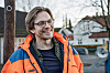 Og der. På vei inn gjennom porten på motsatt side av uteområdet, skimter vi en høy mann iført signaloransje kjeledress. Det må være han.