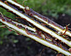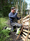 Slik lager han skigarder: To og to staur slås parvis ned i bakken. Skiene legges mellom disse to staurene. Skiene bindes fast med vidjer, det vil si myke, ferske og tynne bjørkekvister.