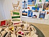 Legg så utvalgte klosser i hauger oppå dem. Teppene gjør at rommet føles mindre kaotisk. De samler oppmerksomhet og virker støydempende. Når klossene ligger samlet på teppene, blir de mer tilgjengelige enn om de ligger i kasser. Det kan derfor hende at barna ser nye muligheter i dem og vil bygge over lengre tid enn ellers.