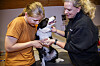 – I dag skal dere lære å gjøre en vanlig helsesjekk. Dere skal se på tennene, sjekke fargen på slimhinnene og se om hun har midd i ørene. Hadde jeg hatt med stetoskopet, kunne dere også lyttet til hjertet, sier Ueland mens elevene samles i ring rundt Tesla som lydig legger seg i nye stillinger, med ekstra kos som belønning.
