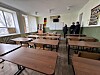The school windows are covered with boards. An Iskander missile hit just a few meters away two weeks earlier. Nataliia shows her classroom. The door says 8A.