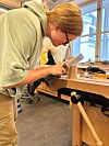 Samme dag som det tegnes og sys på vg2 søm og tekstilhåndverk lages det krevende sammenføyninger på vg2 trearbeid. Her møter vi lærer Pål Wang Engedahl. Han mener skolen har gjort et godt grep med å etablere et treårig tilbud der elevene arbeider integrert med studiekompetanse og yrkesfaget. Andelen som velger å fortsette som lærling, var på sitt foreløpig høyeste i 2021 med 10 av 15. At noen elever velger studier som produktdesign på OsloMet eller tradisjonshåndverk hos USN i Rauland synes han ikke svekker tilbudets betydning for rekruttering til relevante yrker og fagmiljøer.