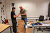 Rundt ham står elever i andre klasse i hver sin selvbygde bås og trekker ledninger. Målet er at en grønn motor nær gulvet skal starte. Flere må ha hjelp fra læreren. Ett eller annet sted har de koblet feil.