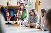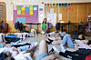 Kontaktlærer Ellen Hansen setter på musikk, og barna stemmer i med sangen «Du Er Suveren». Så er det er tid for leirbål, klasserommet ryddes og alle legger seg ned i en ring.