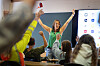 Hun henter fram såpeboblene. På den står det FEILTASTISK. Hun minner elevene på at det er trygt å feile i klassen. Feiring kan også gjøres med å vifte med flagget eller blåse i en fløyte.