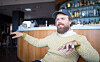 Ivrig har gründeren svart på våre spørsmål, mens det stadig vekk har vært folk bortom og rost innlegget hans. Han stiller også opp på det meste fotografen foreslår. Når vi ber han klatre litt opp, vegrer han seg.
