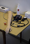 Blodtrykksmåling er en av de fritt valgte oppgavene. På grunn av smittefaren må den fortsatt gjøres på plastarmen, som ligger på bordet.