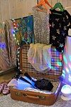 gjenbruksklær fulle av gull, glitter og paljetter. Sett opp et diskolys og lag billetter til