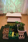 Byggemateriell kan med fordel presenteres som spennende leketablå. En idé er å finne fram dyrene og plassere dem sammen med alle de grønne og trehvite klossene du har. For å gi tablået en ekstra estetisk dimensjon kan du sette opp projektor med stillbilde eller film for å lage bakgrunnskulisse, som en meditasjonsfilm fra YouTube. Da blir byggingen med klosser samtidig en lek med lys og skygge. Lyden av kvitrende fugler og rennende vann kan skape ytterligere atmosfære.Trude Anette Brendeland
