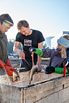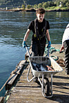 Nicholas (14) tar tak i trillebåra, som Lovise (11) og Kristine (13) har fylt med fisk.