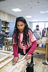 – Jeg liker å bygge og hjelpe til. Det er kjekkere enn å være ute, sier Agasta Pyrakas idet hun pusser nysaget treverk.