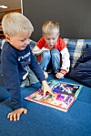 Førsteklassingene Jakob Johansen og Alfred Nerli Thorstensen har funnet en tegneseriebok. Den bruker de til å lage en fortelling sammen. Snart skal de lære å lese.