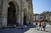 Folk søker tilflukt fra varmen i skyggen i Arles, sør i Frankrike.
