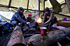 Han finner fram sag og går løs på en bjørkestamme. Den er seig. Han sager, svetter og dytter på stammen før den endelig faller. Da kommer Even med øksa. Slagene treffer perfekt, greiene faller, samles og tas med inn i lavvoen.
