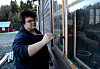 På en benk i verkstedet hennes ligger flere vinduer som hun har restaurert, det vil si skrapt rene, grunnet og malt ett strøk med linoljemaling. Vinduene skal ha to strøk linoljemaling før de blir ferdige.