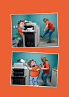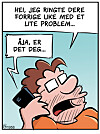 Kaffekopp og briller er i veien og holder på å gå i gulvet. Hårtjafser i øynene gjør at han ikke kan se stort på displayet. Det kommer noen gloser over krølltoppens lepper. Alt ordner seg heldigvis; de bestilte kopiene mates ut av maskinen som denne gangen er samarbeidsvillig.