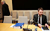 Kunnskapsminister Torbjørn Røe Isaksen (t.h.) og Martin Kolberg (på vei ut av bildet) før høringen i Stortingets kontroll- og konstitusjonskomité om statstilskudd til høyskolene NITH, Westerdals og NISS onsdag. Foto: Lise Åserud / NTB scanpix