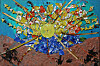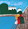 Hun viser fram et foto av barna på broen, og maleriet som barna senere samarbeidet om å lage.
