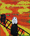 De tar seg god tid når barna samarbeider om å lage Munch-inspirerte kunstverk. Det kan gjøres over flere dager, hvor stadig nye ideer dukker opp underveis. En gang malte de på et stort laken som hang ute og også fikk bli preget av vær og vind.