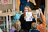 Bilda frå boka blir vist på stor skjerm medan ei av studentane les. På avtalte stader gjer dei stopp i lesinga for å snakke om ulike hendingar i tekst eller bilde. Også ungane stoppar lesinga på ulike tidspunkt når dei finn noe dei meiner er spesielt rart eller fint. Dei går gjerne heilt fram til skjermen for å peike på det dei vil diskutere, men slike avbrot øydelegg på ingen måte konsentrasjonen i rommet, tvert om.