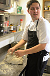 Nå står han og ruller rundstykker som skal stekes til frokosten neste morgen.
