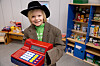 På ein benk står fleire kassar med utkledingsklede: dokterfrakken, dressjakker, hattar, koffertar, vesker og ei heil mengd kostyme av ulike slag. På ti minuttar er elevgruppa omgjort til turistar, kokkar og servitørar. Nokre er dyr, og det er både dronning og prinsesse til stades.