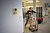 Han har en fast rute gjennom arbeidsdagen, etasje for etasje. Utenfor ett klasserom vinker han i vinduet.