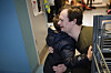 Han hilser blidt tilbake til elever og lærer. Det blir noen klemmer også.